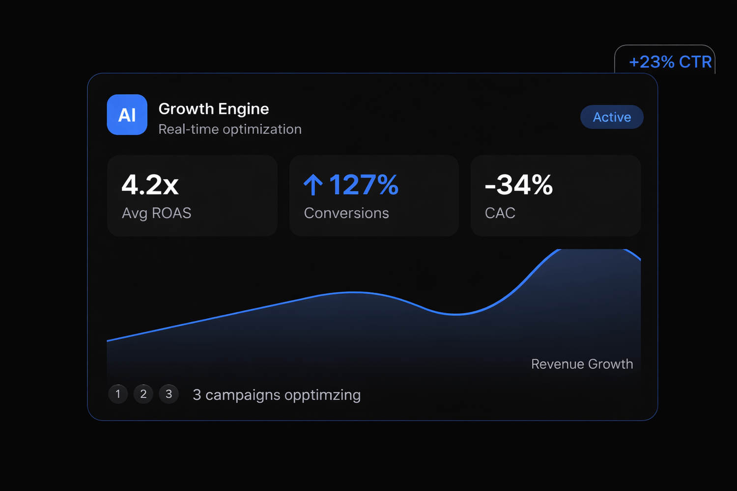 AI handles the heavy lifting — pattern recognition, A/B testing at scale, 24/7 monitoring. Your strategist focuses on creative direction and business goals.